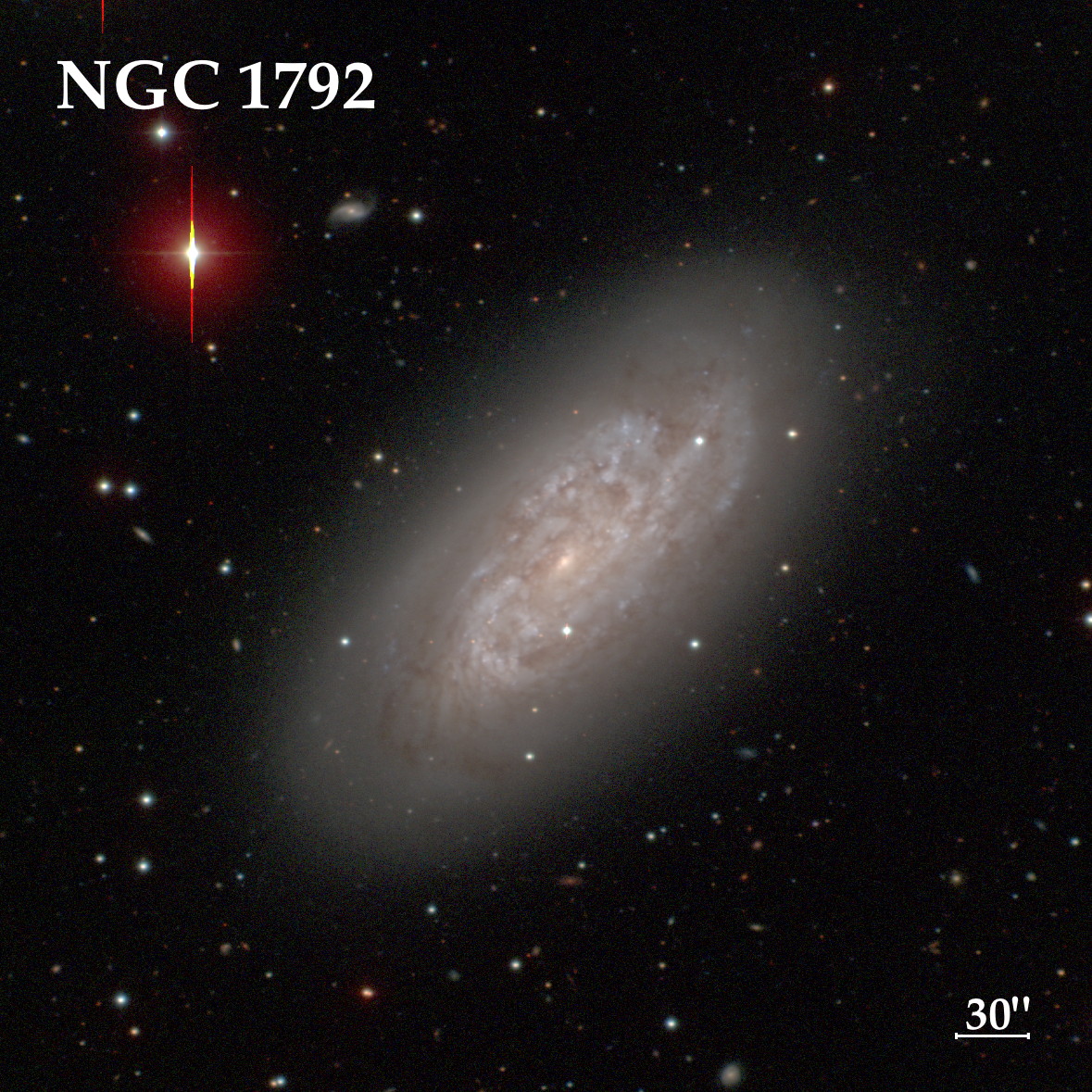 NGC 1792 – еще одна спиральная галактика с баром. Имеет блеск 10,0m и видимые размеры 5,2' × 2,6'. Тоже для южных наблюдателей.