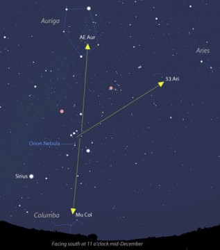 μ Col – «убегающая» звезда. Имеет блеск 5,18m и находится на расстоянии около 1300 св. лет от нас. Установлено, что μ Col и AE Aur движутся друг относительно друга со скоростью 200 км/с! Причем из одной области пространства от звезды ι Ориона. Считается, что это результат близкого прохождения этих звезд друг возле друга с выбросом из системы. Эффект типа гравитационной пращи. Положение μ Col на небесной сфере.