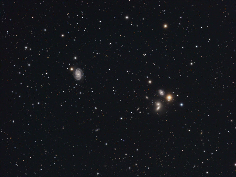 Группа Hickson 68 и NGC 5371 – интересная группа из 5 галактик, расположившихся в пределах 8′ (NGC 5350 – 11,6m, NGC 5353– 11,1m, NGC 5354 – 11,5m, NGC 5355 – 13,0m и NGC 5358 – 13,7m), а также находящаяся неподалеку NGC 5371 – 10,5m. Более яркие галактики можно увидеть и в средние телескопы, а для тех, что послабее, понадобится темное небо и апертура побольше.