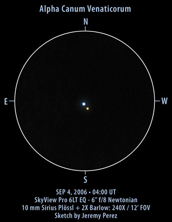 α CVn ( Сердце Карла) - очень красивая двойная звезда, двойственность которой видна даже в бинокль. Главный компонент голубовато-белого цвета со средним блеском 2,9m имеет желтый спутник 5,52m на расстоянии 19,3". Прекрасно смотрится и в небольшие телескопы. Примерно так выглядит в 150 мм телескоп.