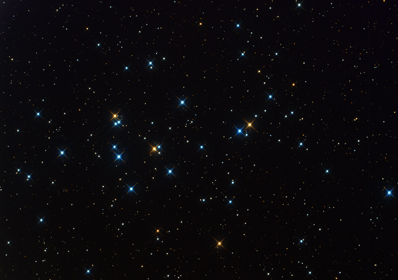 М67 – довольно яркое и крупное рассеянное скопление, имеет видимый блеск 6,1m и видимые размеры 30,0'. Находится на расстоянии около 2700 св. лет от нас. Включает в себя более 500 звезд, из которых немало красных гигантов и белых карликов. Возраст скопления оценивается до 5 млрд. лет. Это одно из старейших известных рассеянных скоплений. Даже в «Алькор» на фоне туманного пятнышка различаются отдельные искорки звезд, в 114-мм телескоп можно различить пару десятков звезд, а с 200-мм апертурой при хорошем небе видно до сотни звезд! Многие из них имеют блеск 10-11m и желто-оранжевый цвет. Хорошо заметна концентрация звезд к центру скопления.