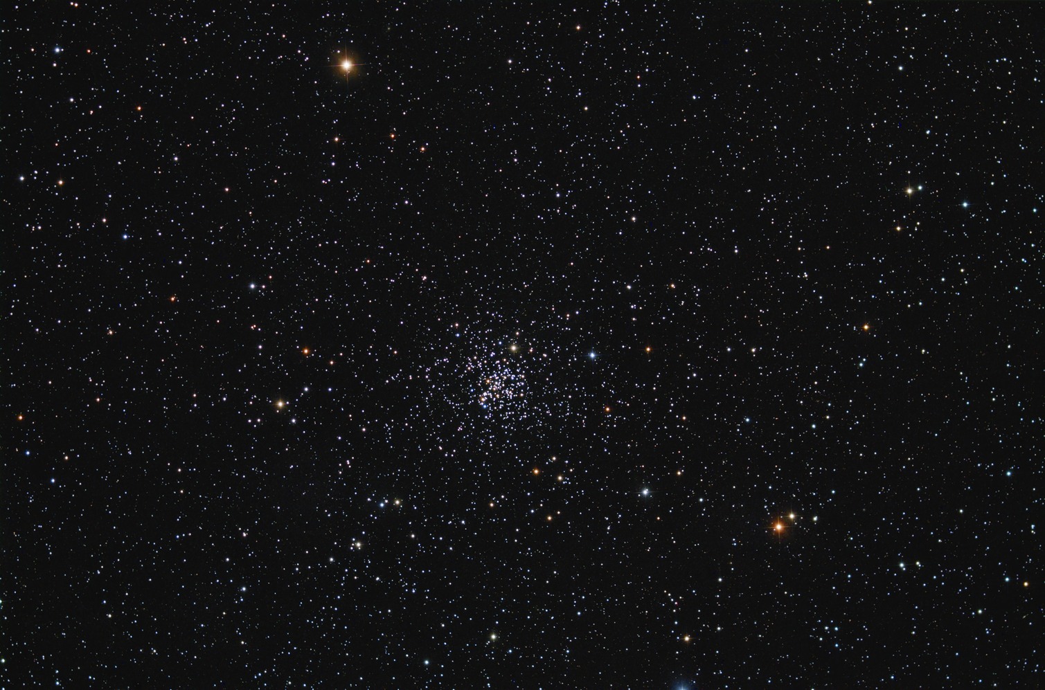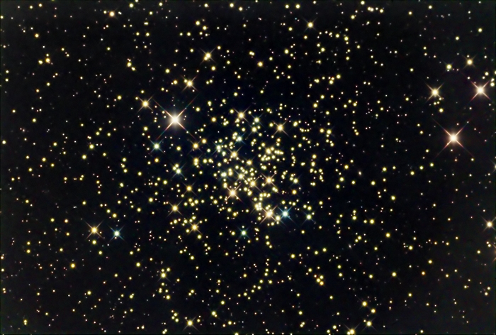 Звездное скопление М67 на широком поле - примерно таким его можно увидеть в крупный бинокль или короткофокусный телескоп с 2" окуляром. Авторы фото Noel Carboni и Greg Parker