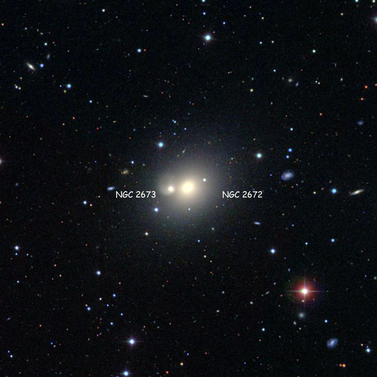 NGC 2672 – эллиптическая галактика, имеет видимый блеск 11,2m и видимые размеры 3,0' × 2,8'. Расположена на расстоянии около 200 млн. св. лет от нас. В 200-мм телескоп она различается уверенно на темном небе. Но, оказывается, возле неё имеется галактика спутник NGC 2673 -эллиптическая галактика с видимым блеском 13,0m и видимыми размерами 1,2' × 1,2'. Чтобы различить эту двойную галактику нужен телескоп не менее 250-300 мм.