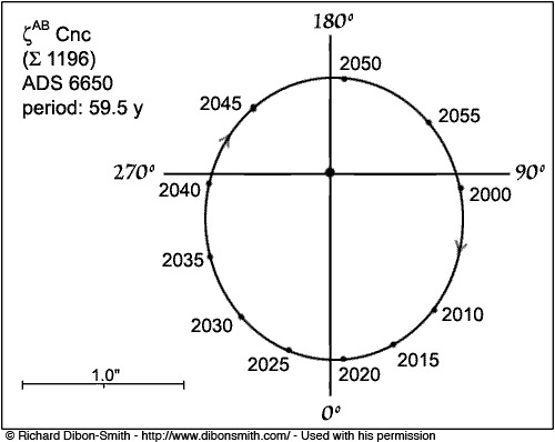 Несмотря на небольшие размеры и отсутствие ярких звёзд в созвездии имеется немало интересных двойных и кратных звёзд. γ Cnc (Азеллус Бореалис) - симпатичная тройная система. Главный компонент белого цвета с блеском 4,66m имеет спутники с блеском 8,7m на расстоянии 111,7'' и 12,4m на расстоянии 103,3''. Однако, все эти звезды физически между собой не связаны, а расположены вдоль луча зрения на разных расстояниях от Солнца. ζ Cnc (Тегмен) – одна из интереснейших кратных звёзд созвездия. Главный компонент представляет собой пару желтовато-белых звёзд с блеском 5,31 и 6,25m, разделённых в 2016 году промежутком около 1,2''. Для её разделения понадобится телескоп с апертурой не менее 114 мм. На небольшом расстоянии 6,2'' расположен третий компонент с блеском 5,85m, который можно увидеть и в малый телескоп. Но Тегмен С сам является тройной звездой! Вокруг главной звезды желтого цвета на неразличимых для любительских телескопов 0,3" обращается пара красных карликов с общим блеском 10m. Эта пара является спектрально-двойной, и визуально разделить её нельзя. Вот такая система из 5 звезд! Орбита главных компонентов.