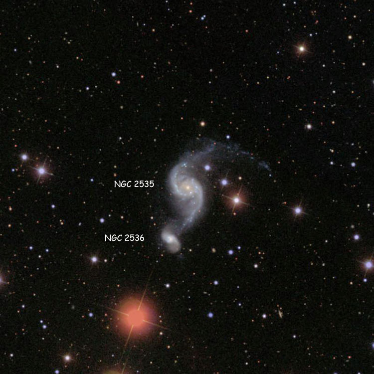 NGC 2535 – своеобразная на вид спиральная галактика, является взаимодействующей. На конце одной из её спиральных ветвей расположена галактика NGC 2536. Находится эта пара на расстоянии около 190 млн. св. лет от нас. NGC 2535 имеет видимый блеск 12,6m и видимые размеры 2,5′ × 1,2′, что делает её вполне доступной для 150-мм телескопов. Спутник же с блеском 14,1m различим скорее с 250-мм апертурой.