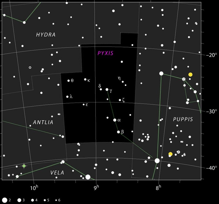 Латинское название: Pyxis (сокращенное Pyx). Это созвездие южного полушария неба - одно из "молодых" созвездий. Было предложено французским астрономом Никола Лакайлем в 1754 году под названием «Компас Мореплавателя». По своим размерам маленькое и малоприметное созвездие. Содержит всего 3 звезды с блеском 4m. Из-за своего южного расположения труднонаблюдаемо в наших широтах. Полностью созвездие видно южнее 53-й параллели, но лучше наблюдать его где-нибудь на широте Крыма или во время отдыха в южных странах! Наилучшее время для наблюдений – февраль и март. В силу своего южного расположения и бедности звёздами найти созвездие на небе представляется весьма трудной задачей, особенно для новичков. Искать его надо к востоку от Большого Пса и южнее звезды Альфард (α Гидры). Занимает на небе площадь в 220,8 квадратных градуса и содержит 25 звезд, видимых невооруженным глазом.