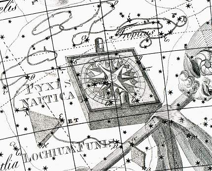 Как уже было указано выше, это «молодое» созвездие, а в 18 веке ученые астрономы относились к мифологии скептически и предпочитали новым созвездиям давать названия из окружающей их действительности. Вот и Никола Луи де Лакайль в 1754 году после экспедиции на Мыс Доброй Надежды решил безымянный участок небесной сферы, на который «заползала» мачта, существовавшего ещё в то время созвездия «Корабль Арго», выделить в отдельное созвездие и назвать его «Компас Мореплавателя». Очень верное решение! Без Компаса Кораблю никак нельзя! С другой стороны, на мифическом Корабле Арго не могло быть Компаса. Его изобрели в Китае «всего» около тысячи лет назад. Судя по всему, Лакайль предпочитал более сложные названия, чего не скажешь о большинстве астрономов. Позднее название сократили. А в 1844 году английский астроном Джон Гершель предложил вернуться к древнегреческим истокам и вместо Компаса использовать название Мачта, но его предложение не прижилось… Все таки, расположение 3-х главных звёзд созвездия по прямой почти строго с юга на север, пожалуй, больше напоминает стрелку компаса, чем мачту. К тому же и «Корабль Арго» после более полуторатысячного «плавания» не выдержал и «развалился» на 3 созвездия. Созвездие Компас в Уранографии Й. Боде.