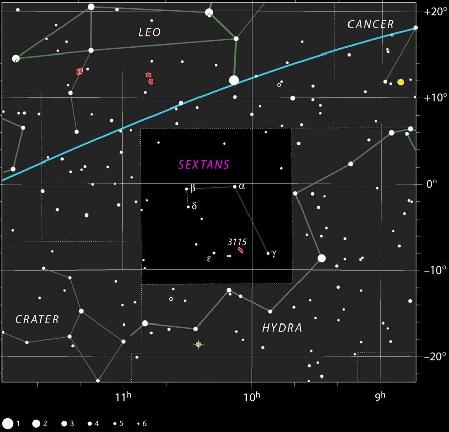 Хотя созвездие и не упомянуто в знаменитом каталоге Мессье, близость ко Льву обусловило наличие в нем не малого числа галактик. NGC 3115 (галактика Шпиндель) – линзообразная галактика с блеском 9,1m и видимыми размерами 7,2' × 2,4'. Сравнительно близкая к нам галактика, расположенная на расстоянии 31,6 млн. св. лет. Исследования галактики показали, что в её центре находится сверхмассивная черная дыра массой около 2 млрд. солнечных! И это была одна из первых, обнаруженных сверхмассивных ЧД. Есть предположение, что в пору своей «юности» эта галактика представляла собой квазар. В любительские телескопы выглядит вытянутым туманным пятнышком.
