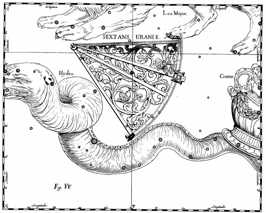 Древнегреческим астрономам такой прибор как секстант был не известен. Он появился много позже, и потому в мифологии не упоминается. Ну а как же секстант попал на звездное небо? Со времен древнегреческих астрономов на небесной сфере оставались участки, которые из-за слабости расположенных на них звёзд оказались за пределами 48 созвездий, вошедших в Альмагест. Во времена Великих географических и астрономических открытий средневековые астрономы решили восполнить эти пробелы! Особым усердием на этом поприще отличался польский астроном Ян Гевелий. Конечно же, следуя современным веяниям, они старались поместить на небо не каких то там мифологических героев и животных, а хорошо известные предметы и, пусть и ранее не виданных, но существующих заморских диковинок. Одним из любимейших инструментов Гевелия был, расположенный в его астрономической обсерватории, секстант, на котором он вел наблюдения с 1658 года. Но в 1679 году произошло несчастье! В результате пожара обсерватория, а с ней и секстант, сгорели. Гевелий не смирился с потерей и предложил в честь такого необходимого инструмента небольшой участок неба возле Льва и Гидры назвать созвездием Sextans Uraniae. Некоторые астрономы по этому поводу даже допускали язвительные замечания, узрев в этом астрологические корни. Что интересно, наряду с телескопами, Гевелий до конца жизни продолжал пользоваться для измерений инструментами уже ушедшей эпохи. Позднее, как это нередко бывало, название созвездия несколько урезали.