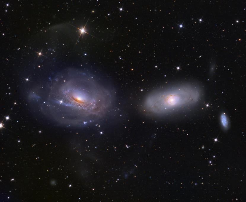 NGC 3166 и NGC 3169 (Распутывающая галактика) – линзообразная и спиральная галактики с видимым блеском 10,5m и 10,3m и видимыми размерами 4,8' × 2,3' и 4,2' × 2,9' соответственно. Обе галактики находятся на расстоянии около 70 млн. св. лет от нас, а расстояние между ними «всего» 50 тыс. св. лет. Обе галактики имеют признаки взаимодействия и в «скором» будущем сольются в одну. Складывается ощущение, что спирали галактики NGC 3169 как бы распутываются под действием NGC 3166. Эта пара вполне доступна для любительских телескопов средних размеров. Сбоку можно разглядеть маленькую, более слабую галактику NGC 3165.