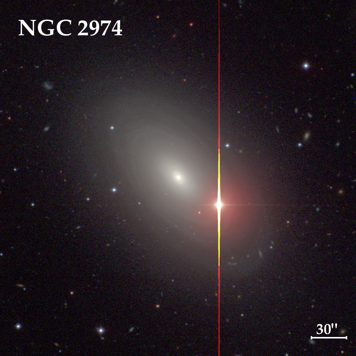 NGC 2974 - эллиптическая галактика, имеет видимый блеск 10,9m и видимые размеры 3,4' × 2,1'. Расположена на расстоянии около 90 млн. св. лет от нас. В любительские телескопы выглядит туманным пятнышком с проецирующийся на неё звездой сходного блеска.