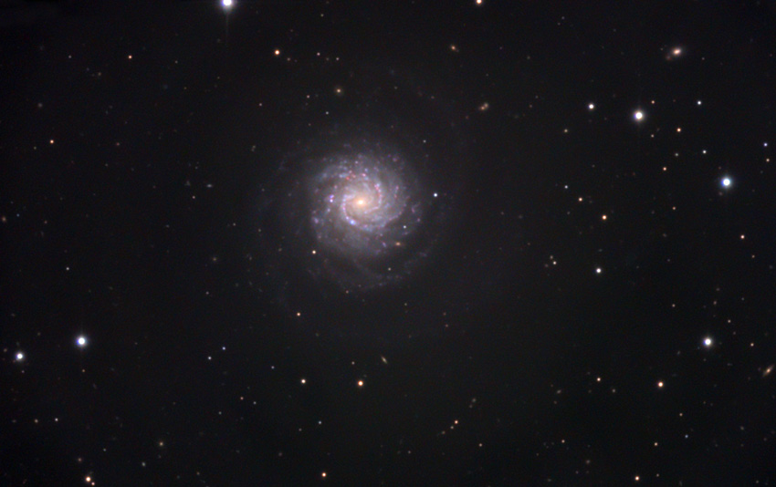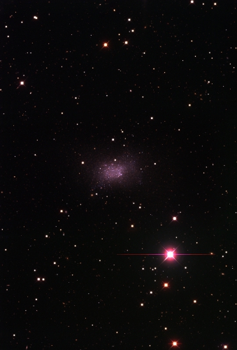 Sextans A - карликовая неправильная галактика, всего 5000 св. лет диаметром. Входит в Местную группу галактик и находится на расстоянии 4,3 млн. св. лет от нас. Была обнаружена немецким астрономом Фрицом Цвикки в 1942 году. Необычность этой галактики, в первую очередь, связана с её формой, напоминающей квадрат. Вероятно около 100 млн. лет назад в этой галактике произошла серия взрывов сверхновых звезд, которая спровоцировала вспышку звездообразования. Среди вновь образовавшихся звезд было много массивных, которые тоже заканчивали свою эволюцию взрывами сверхновых и выбросом оболочек в окружающее пространство. Все это в совокупности и привело к образованию такой формы галактики, конечно же, видимой таковой только с нашего направления. Галактика имеет интегральный блеск 11,9m и видимые размеры 5′,9 × 4′,9. И, даже в наших краях, она довольно высоко поднимется над горизонтом. Потому может вызвать некоторое удивление, что она была обнаружена только в 1942 году. Причина в её низкой поверхностной яркости. На известном сайте deepskypedia имеется всего одна запись о любительских наблюдениях этой галактики, да и то с 20-дюймовой апертурой! Астрофотографам, наверное, немного полегче!