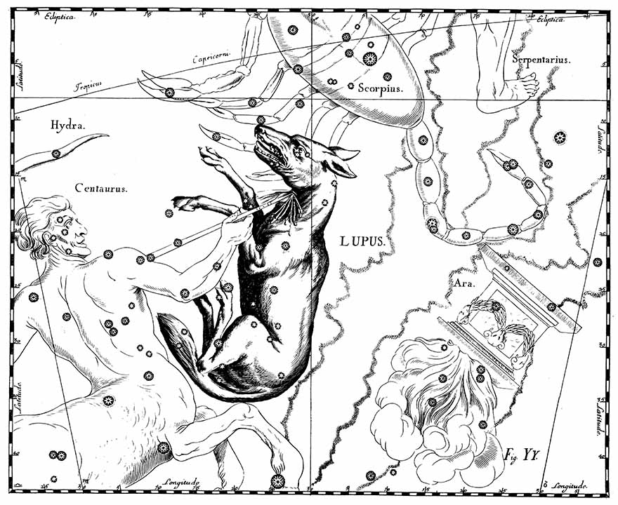 Латинское название: Lupus (сокращенное Lup). Это среднее по размерам созвездие южного полушария неба - одно из самых древних. Включено в каталог звёздного неба Клавдия Птолемея «Альмагест». Располагается оно к юго-западу от созвездия Скорпиона, заметно вытянуто с севера на юг и может быть легко найдено с помощью яркого Антареса (α Sco). К сожалению, в наших широтах видна только северная часть созвездия, но некоторые любители астрономии не отказывают себе в удовольствии отдохнуть на южных курортах и потому иногда могут позволить себе полюбоваться «волчьими» достопримечательностями! Благо, что таковые имеются. Именно в этом созвездии находится остаток вспышки сверхновой 1006 года, самой яркой исторической сверхновой, наблюдавшейся земными астрономами! Полностью созвездие видно южнее 35-й параллели. Наилучшее время для наблюдений - май. Занимает на небе площадь в 334 квадратных градуса и содержит 70 звезд, видимых невооруженным глазом.