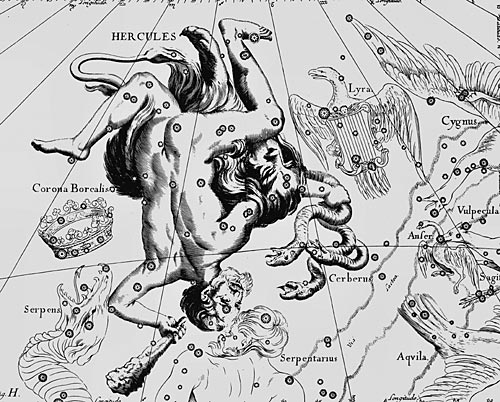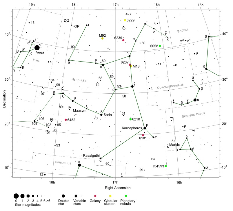 Латинское название: Hercules (сокращенное Her). Это созвездие северного полушария неба - одно из самых древних созвездий. Включено в каталог звёздного неба Клавдия Птолемея «Альмагест». Однако в те времена созвездие называлось «Коленопреклонённый». Хотя в Греции это созвездие еще с 5 века до н.э. также называли «Геракл», которое позже закрепилось в латинизированном варианте Геркулес. Наилучшие условия для наблюдений в мае - сентябре, когда созвездие высоко поднимается над горизонтом, причем в наших широтах северная часть созвездия является незаходящей. В созвездии находятся 3 звезды ярче 3m, и найти его сравнительно просто правее ярчайшей звезды летнего неба Веги (α Лиры) по выделяющейся трапеции из звезд ε, π, η и ζ (астеризм «Краеугольный камень»). Кроме того, звёзды - ε, δ, β, π, η и ζ определяют другой астеризм «Бабочка». Это 5-е по величине созвездие, занимающее на небе площадь в 1225 квадратных градуса и содержащее 140 звезд, видимых невооруженным глазом. И неудивительно, что оно весьма богато разными интересными для любителей астрономии объектами.