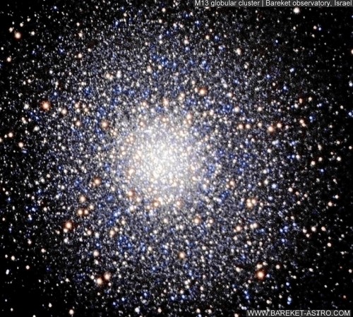 Несмотря на свои размеры созвездие не отличается обилием доступных для любителей астрономии "дипскаев", особенно "не достает" рассеянных скоплений и газо-пылевых туманностей. Тем не менее, как и в каждом созвездии, своя изюминка имеется, а в случае Геркулеса это целый бриллиант! М13 (Hercules Globular Cluster) - Великое Скопление Геркулеса, вероятно, самое известное шаровое скопление северного неба. Оно находится в 2°30' южнее звезды η Her и может быть замечено темной ясной ночью подальше от городских огней невооруженным глазом в виде расплывчатой звезды. Имеет блеск 5,8m и видимый размер 23′. Расположено на расстоянии около 24 000 св. лет от нас и содержит около 300 000 звезд, заключенных в сфере диаметром 165 св. лет. Даже в "Алькор" (65-мм рефлектор) звездная природа скопления не вызывает сомнения! По краям оно начинает "искрить". Ну а кто хотя бы раз увидел скопление в 300-мм телескоп, никогда не забудет феерическое зрелище тысяч звездочек, от которых буквально рябит в глазах! Уже в 150-200мм телескопы на фоне скопления можно различить, так называемый, "Пропеллер" - темные пылевые полоски в виде буквы Y, расположенный к юго-востоку от центра. В 1974 году с помощью 305-метрового радиотелескопа обсерватории Аресибо в направлении М13 было отправлено послание тамошним цивилизациям, если они там, конечно, есть. Ждать ответ придется 50 000 лет!