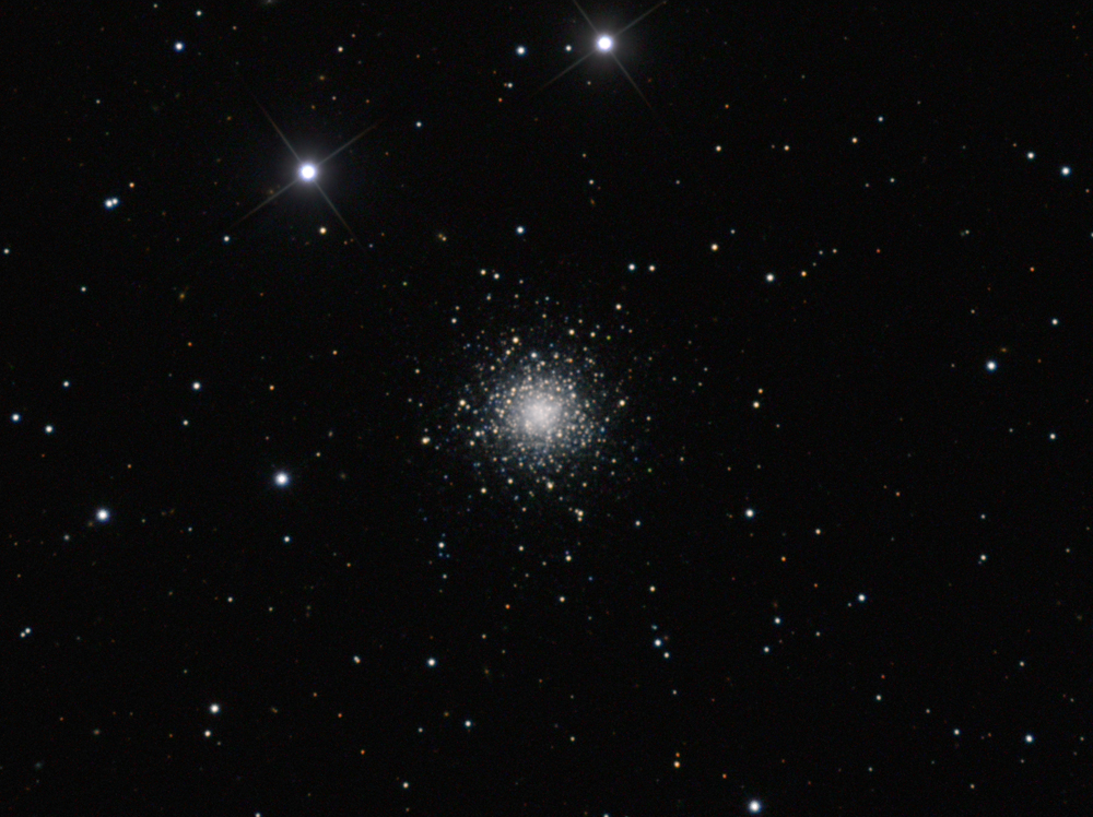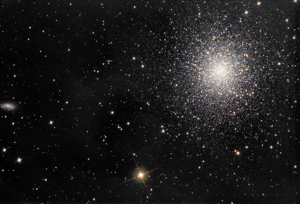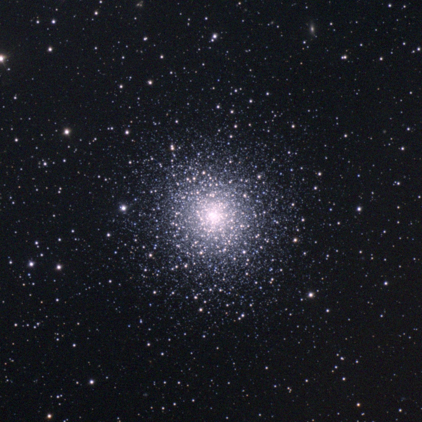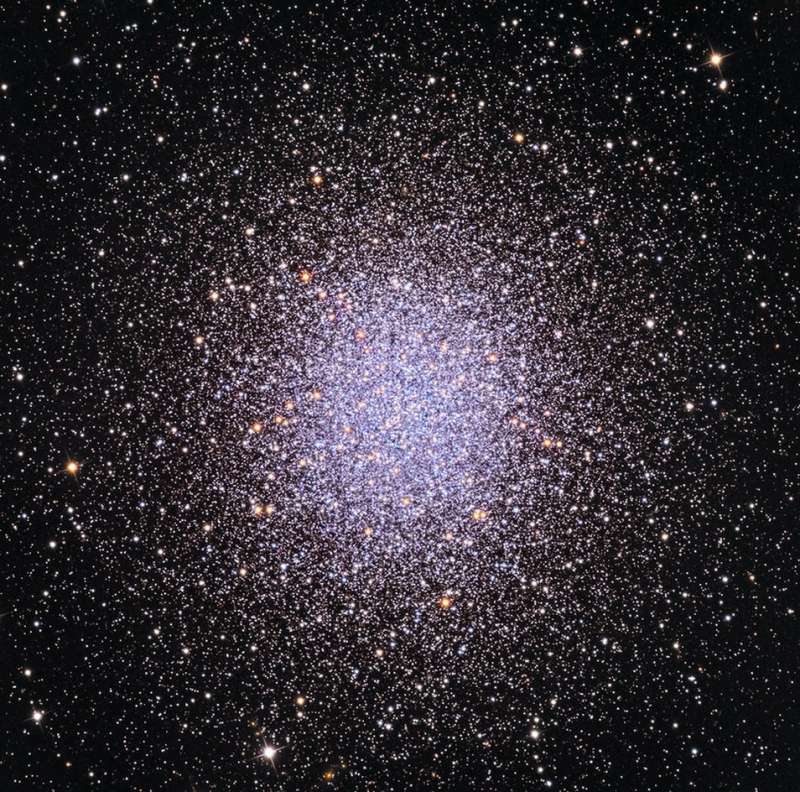 В 1716 году английский астроном Эдмонд Галлей отметил: "Это маленькое пятнышко, и его можно разглядеть невооруженным глазом, когда небо безоблачно и прозрачно и на нем нет Луны". Конечно, сейчас M13 считается огромным шаровым скоплением, одним из ярчайших шаровых звездных скоплений на северном небе. В телескоп можно увидеть сотни тысяч звезд этого великолепного скопления, расстояние до которого – 25 тысяч световых лет. Звезды скопления теснятся в области диаметром 150 световых лет, а вблизи ядра скопления в кубе со стороной в три световых года могут помещаться до ста звезд. Для сравнения, ближайшая к Солнцу звезда удалена от нас на 4 световых года. На этом четком цветном изображении можно увидеть как плотное ядро скопления, так и его внешние части. Проэволюционировавшие красные и голубые звезды-гиганты скопления выделяются своей желтоватой и голубой окраской. Авторы и права: Адам Блок