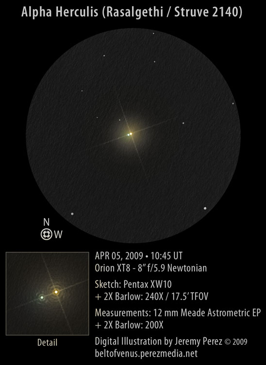 Созвездие особенно богато двойными звездами. Приведем некоторые из них. α Her (Рас Альгети) – очень красивая визуально-двойная звезда. Главный компонент красноватого цвета с блеском 2,8-3,5m имеет желтый спутник 5,4m на расстоянии 4,9". Прекрасно смотрится даже в небольшие телескопы. Сам спутник является спектрально-двойной звездой. Кроме того, у этой троицы имеется оптический спутник 11,1m на расстоянии 79,2".