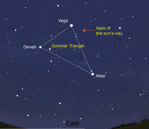 Апекс Солнца – объектом его, конечно, не назовешь, но все равно, небезынтересное явление. Это точка, в сторону которой Солнце движется относительно ближайших звёзд со скоростью 20 км/с, имеющая экваториальные координаты α = 270°, δ = 30°. Солнечный апекс расположен вблизи границы Геркулеса с созвездием Лиры.