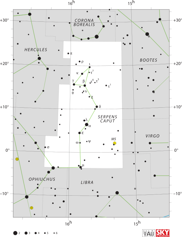 Созвездие содержит 2 объекта из знаменитого каталога Мессье. М5 – шаровое скопление, имеет блеск 5,7m и видимый размер 23,0′. Расположено на расстоянии около 24 500 св. лет от нас и содержит до 500 000 звезд, заключенных в сфере диаметром 165 св. лет. Это одно из ярчайших шаровых скоплений северного неба и одно из крупнейших из известных. Так же при возрасте в 13 миллиардов лет это скопление является также одним из старейших. Находится в Голове Змеи. При темном загородном небе скопление можно заметить невооруженным глазом в виде туманного пятнышка. Даже в малые телескопы выглядит таким мохнатым кружком. В 200-мм телескоп разбивается на искорки множества звезд с заметно более ярким ядром.
