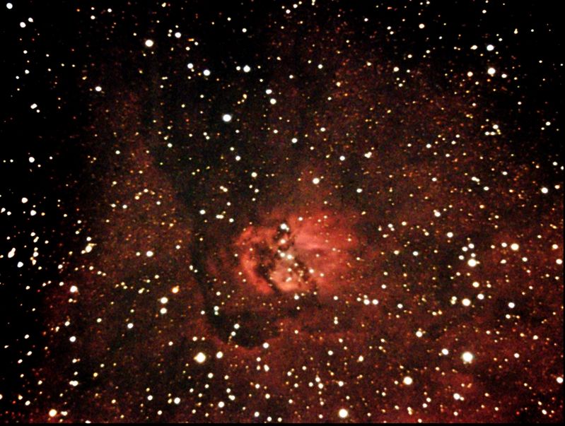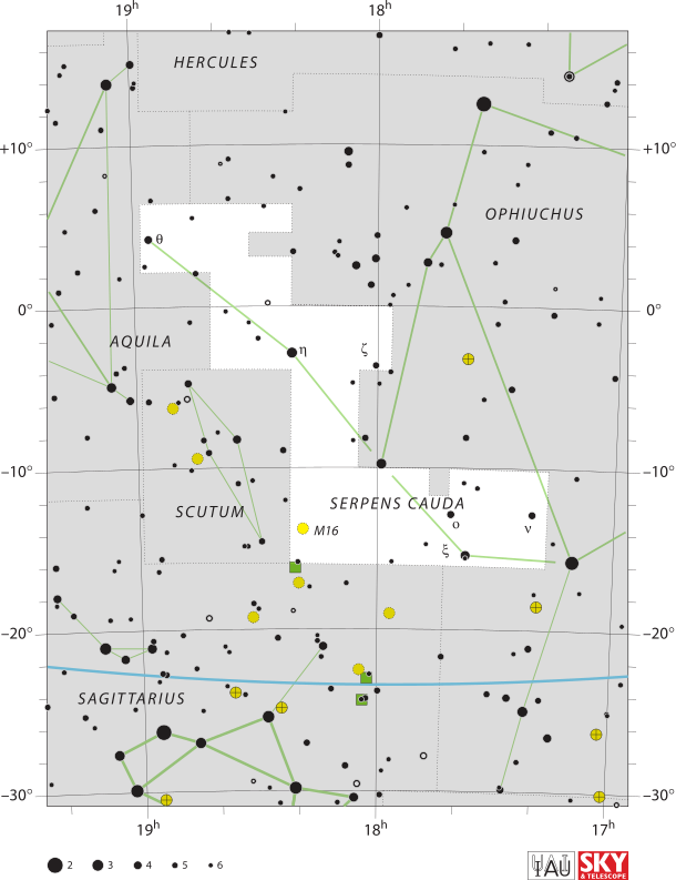 М16 (Туманность Орёл) - представляет собой область звездообразования, в которой на фоне эмиссионной туманности находится молодое рассеянное звездное скопление. Излучение молодых горячих звезд, погруженных в туманность, создает причудливые изображения. Имеет интегральный блеск 6,4m при видимых размерах 7,0'. Находится на расстоянии 7000 св. лет от нас. Размеры туманности 70×55 св. лет, а звездного скопления 15 св. лет. Некоторые, весьма своеобразные части туманности, имеют собственные названия - «Столпы творения», «Фея», «Орлиные «яйца»». Различить их в любительские телескопы вряд ли удастся, но мы к ним еще вернемся в разделе необычных объектов.