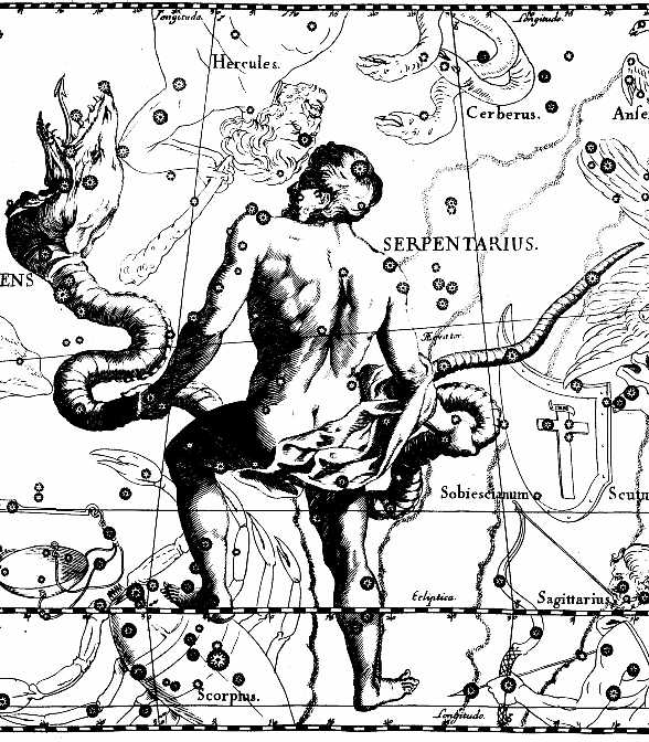 Как уже было указано, Птолемей включил в «Альмагест» только западную часть современного созвездия – Голову Змеи. Многие астрономы в последствии не считали Змею самостоятельным созвездием, а относили её звезды к Змееносцу. Другие же были склонны их разделять. В общем, кто что хотел, то и творил! Точка в этих разногласиях была поставлена Международным астрономическим союзом в 1922 году, когда были утверждены современные границы созвездий. С тех пор Змея является созвездием, состоящим из двух частей. В древнегреческой мифологии Змея неразрывно связана со Змееносцем, у которого имелся реальный исторический прототип! Более 4500 лет назад в Древнем Египте жил Имхотеп, верховный сановник фараона Джосера. Он считается первым известным в мировой истории архитектором и учёным. Позднее был обожествлен и почитался в качестве бога врачевания. В древнегреческой мифологии он стал прообразом древнегреческого бога медицины и врачевания Эскулапа (Асклепия) - сына бога Аполлона. Аполлон отдал Асклепия в обучение мудрому кентавру Хирону, чтобы в будущем он смог помогать людям и облегчать их страдания. Очень скоро Асклепий овладел знаниями о мире и божествах, о морях и горах, о лугах и цветах. Он узнал, какой травой нужно лечить от определенной болезни, научился перевязывать раны так, что они быстро заживали. Когда мальчик вырос, он стал известным врачевателем. Когда аргонавты отправились в Колхиду за золотым руном, Асклепий стал у них корабельным лекарем. Однажды Асклепий убил змею и увидел, как другая змея при помощи целебных трав сумела воскресить погибшую. Вот так и Асклепий научился воскрешать мертвых, а когда боги вознесли его на небо и превратили в созвездие, то и про змею они тоже не забыли. Так и движутся они вместе по небосклону уже тысячи лет… Есть также версия, что в созвездии Змеи богиня Гера увековечила одну из змей, посланных ею к колыбели маленького Геркулеса, чтобы погубить будущего героя, и которую Геркулеса задушил. Не удивительно, что на небесной сфере Геркулес находится против Змееносца, а взгляд его направлен на Змею, которую он готов задушить протянутой к ней рукой. Созвездие Змеи почиталось и в древнем Вавилоне, причем у вавилонских астрономов на небе было две змеи. Одна из них представляла собой гибрид дракона, льва и птицы, и соответствует современному созвездию Гидра, водяной змее. А вторая змея была рогатой. Вот от неё с подачи древнегреческих астрономов и пошло современное созвездие Змея.