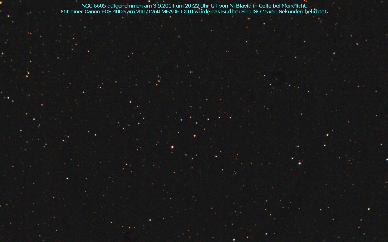 NGC 6605 – рассеянное скопление, имеет блеск 6,0m и видимый размер 29,0′. Весьма разреженное скопление, можно сразу и не обратить на него внимание.