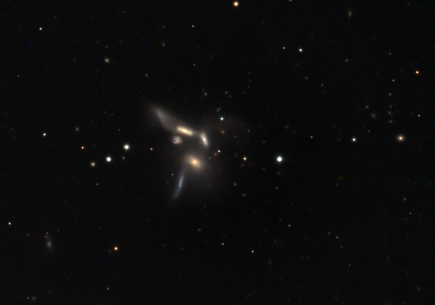 NGC 6027 (Секстет Сейферта) – очень компактная группа (размерами не более 100 тыс. св. лет) из 6 галактик, из которых одна является галактикой фона, а еще одна представляет собой отделившуюся часть другой галактики. Основная группа галактик находится на расстоянии около 190 млн. св. лет. Смотрится очень красиво и необычно, но, к сожалению, только на фото в крупные телескопы. Наиболее яркие члены группы имеют блеск 13,2-13,8m, и, в принципе, на темном небе группу можно различить с 200-мм апертурой. Лучше, конечно же, использовать хотя бы 300 мм.