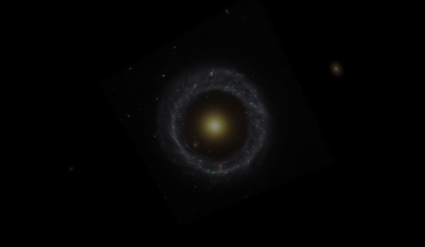 Объект Хоага: странная галактика в созвездии Змеи. Фотография была получена Космическим телескопом им.Хаббла и переобработана, используя новый алгоритм подавления шумов. Наблюдения в радиодиапазоне показывают, что объект Хоага не поглощал маленьких галактик за последний миллиард лет. Размеры объекта Хоага составляют примерно 100 тысяч световых лет, он находится на расстоянии 600 миллионов световых лет от Солнца в направлении на созвездие Змеи. Много галактик дальнего фона видно в правой части картинки, а в промежутке между ядром и кольцом (ниже и левее ядра) случайно оказалась далекая кольцеобразная галактика. http://www.astronet.ru/db/msg/1551467