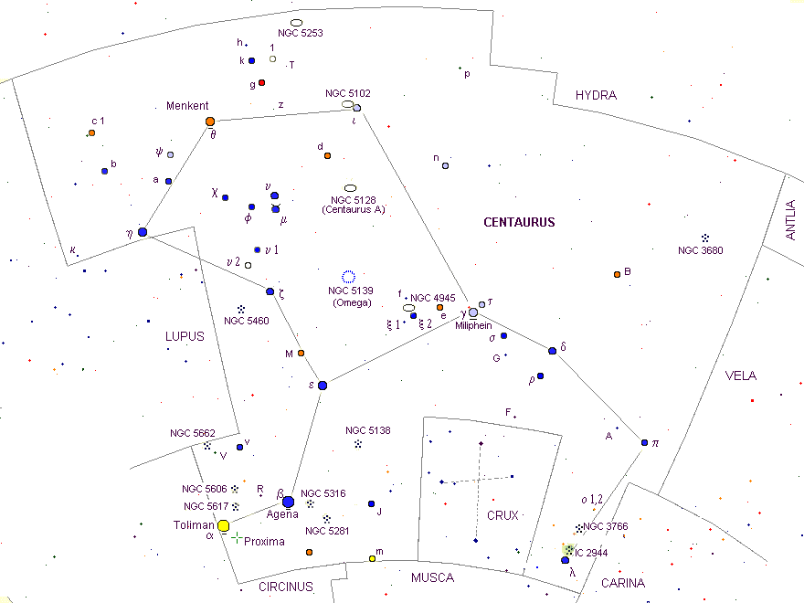Хадар (β Cen) – вторая по яркости звезда созвездия, бело-голубой гигант, расположенный на расстоянии 530 св. лет от нас. Имеет интегральный блеск 0,61m (складывается из блеска неразрешимых невооруженным глазом компонентов с блеском 0,8 и 4,0m). Тройная звезда. Арабское название означает «Низ». Мулифан (γ Cen) - белый субгигант с блеском 2,20m, расположенный на расстоянии 130 св. лет от нас. Двойная звезда. δ Cen - голубой субгигант с блеском 2,58m, расположенный на расстоянии 395 св. лет от нас. Китайское название звезды «Ма Вей». Аль Бирдхаун (ε Cen) - голубой гигант с блеском 2,29m, расположенный на расстоянии 376 св. лет от нас. Арабское название означает «Вьючная лошадь». Альнаир (ζ Cen) - голубой субгигант с блеском 2,55m, расположенный на расстоянии 384 св. лет от нас. Менкент (θ Cen) - оранжевый гигант с блеском 2,06m, расположенный на расстоянии 60,9 св. лет от нас. Арабское название означает «Плечо Кентавра». Виден в наших широтах. Проксима (α Cen С) – самая близкая к Солнцу звезда, расположенная на расстоянии 4,22 св. года от нас. Звезда была открыта только в 1915 году английским астрономом Робертом Иннесом в Южной Африке. Имеет блеск всего 10,68m и потому видна только в телескоп. Это красный карлик со светимостью в 10 тысяч раз и массой в 8 раз меньше солнечной. Входит в состав системы α Cen и находится на 2 световых месяца ближе к нам! Может наблюдаться только южнее 27-й параллели, а фактически даже ещё южнее. Положение Проксимы относительно α Cen и β Cen.
