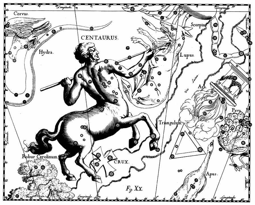 В древнегреческой астрономии созвездие Центавра является самым южным. Оно простирается на юг до склонения -64°. «Но, как такое может быть?» - может спросить знаток географии! «Ведь даже из Египта не увидишь самый юг созвездия!» А все дело в прецессии. Из-за неё со временем некоторые звезды становятся не восходящими в данной местности, зато другие совсем наоборот! Надо сказать, что в древности Центавр был немного побольше, но в Средние Века от него отщипнули маленький кусочек с яркими звездами и выделили новое созвездие – Южный Крест. Древние греки изображали созвездие в виде Кентавра с копьем, на которое был нанизан Волк. И созвездие у них называлось, да и называется Кентавр, но на русском языке в силу давней астрономической традиции оно именуется Центавр (как и Цефей, а не Кефей). В свое время известный советский популяризатор астрономии П. Г. Куликовский призывал изменить традиции, но, как мы видим, не преуспел…. По не вполне ясным причинам в древнегреческой мифологии два созвездия - Стрельца и Центавра - связаны с Хироном, самым мудрым из кентавров, учителем прославленных мифических героев: Геркулеса, Ясона, Орфея, Ахилла и других. Причем они не переплетаются, а являются вариантами одного мифа. Не всегда и разберешь, где идет речь о Стрельце, а где о Центавре! Впрочем, Стрелец вооружен луком, а Центавр копьём. Так что отличить их можно! Существует вариант мифов, в котором Хирон изобрел небесный глобус специально для обеспечения похода аргонавтов в Колхиду. На глобусе Хирон оставил место для себя в виде зодиакального созвездия Стрелец. Но хитрый кентавр Кротос опередил Хирона, заняв его небесное место, и тому пришлось довольствоваться менее почётным по положению созвездием Центавр.