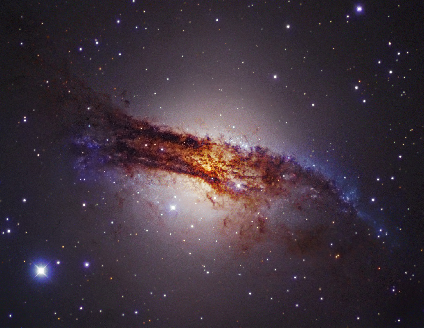 Центавр A (NGC 5128) — линзовидная галактика с полярным кольцом, не характерным для этого типа галактик. Это одна из ближайших к нам и ярчайших галактик. Имеет видимый блеск 6,6m и видимые размеры 25,7' × 20,0'. Находится на расстоянии 12 млн. св. лет от нас. Является мощнейшим источником радиоизлучения – активная радиогалактика. Наличие темной газопылевой полосы объясняется тем, что сравнительно недавно массивная галактика поглотила менее крупную спиральную. В центре галактики имеется черная дыра с массой 55 миллионов солнечных. Со склонением -43° может наблюдаться на побережье Черного моря. В южном полушарии это красивейший объект для любителей астрономии.