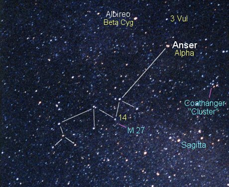 Cr399 (Астеризм «Вешалка») – имеет еще названия «Скопление Ас-Суфи» и «Скопление Брокчи». Первым это скопление описал в 964 году в своей «Книге о неподвижных звёздах» арабский астроном Ас-Суфи. В 1920 году астроном-любитель Д. Брокчи создал карту этого скопления. Астеризм «Вешалка» имеет весьма своеобразную форму и просто притягивает к себе внимание. Состоит из 10 звезд 5-7m. Находится на фоне рассеянного звездного скопления. Находится на прямой линии, соединяющей Вегу (α Lyr) и Альтаир (α Aql) – на 1/3 промежутка от Альтаира. Красиво смотрится в бинокль. Имеет видимые размеры около 60'. До последнего времени астрономы дискутировали о физической связи звезд «Вешалки». Судя по всему, часть звезд не относятся к скоплению, а просто проецируются на него.
