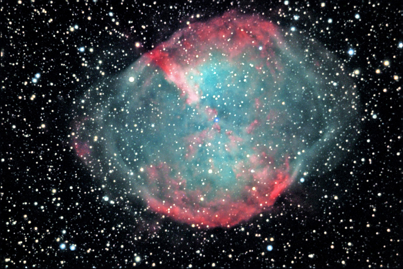 Охотясь за кометами в небесах над Францией XVIII века, астроном Шарль Мессье прилежно заносил в список все встречающиеся ему объекты, которые точно кометами не были. На этой фотографии вы видите объект под номером 27 из его известного каталога не-комет. Астрономы XXI века назовут объект планетарной туманностью. Это – не планета, хоть она выглядит похожей на круглый планетный диск в маленький телескоп. Мессье 27 (M27) – прекрасный пример газовой эмиссионной туманности, образованной звездой типа Солнца на стадии, когда в ее ядре кончилось ядерное топливо. Разлетающиеся в пространство верхние слои оболочки звезды формируют туманность. Атомы газа туманности светятся, поглощая невидимое глазу, но высокоэнергичное ультрафиолетовое излучение умирающей звезды. Известное под именем туманность Гантель, это красивое, симметричное облако газа протянулось на 2.5 световых года. Оно находится на расстоянии в 1200 световых лет от нас в направлении на созвездие Лисички. На этой впечатляющей цветной картинке запечатлены детали как хорошо исследованной центральной части, так и более слабого внешнего гало, которое фотографируется гораздо реже. Изображения были получены с широко- и узкополосными фильтрами, выделяющими излучение атомов водорода и кислорода. Авторы и права: Боб Франке