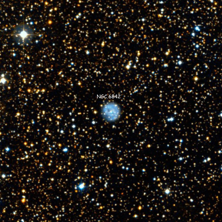 NGC 6842 - планетарная туманность. Имеет блеск 13,1m и видимые размеры 0,95'. Ни в какое сравнение не идет с «Гантелью». Блеск центральной звезды 15,5m. Это объект для крупных телескопов.