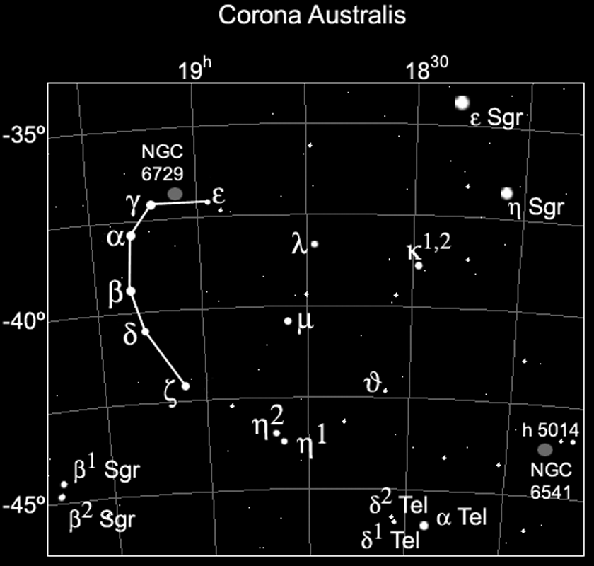 Латинское название: Corona Australis (сокращенное CrA). Это маленькое созвездие южного полушария - одно из самых древних созвездий. Включено в каталог звёздного неба Клавдия Птолемея «Альмагест». Созвездие не содержит ярких звезд. Самая яркая звезда Альфекка Меридиана (α CrA) имеет блеск всего 4,10m. Из-за своего южного расположения труднонаблюдаемо в наших широтах. Полностью созвездие видно южнее 45-й параллели, то есть, вполне наблюдаемо с побережья Черного моря, но, желательно отправиться куда-нибудь южнее. В принципе, найти его нетрудно. Расположено оно к югу от Стрельца и образует фигуру из слабых звезд в виде венца. В известном энциклопедическом словаре Брокгауза и Ефрона приводится его старорусское название «Южный венец». Наилучшее время для наблюдений – июнь и июль. Занимает на небе площадь в 128 квадратных градусов и содержит 30 звезд, видимых невооруженным глазом.