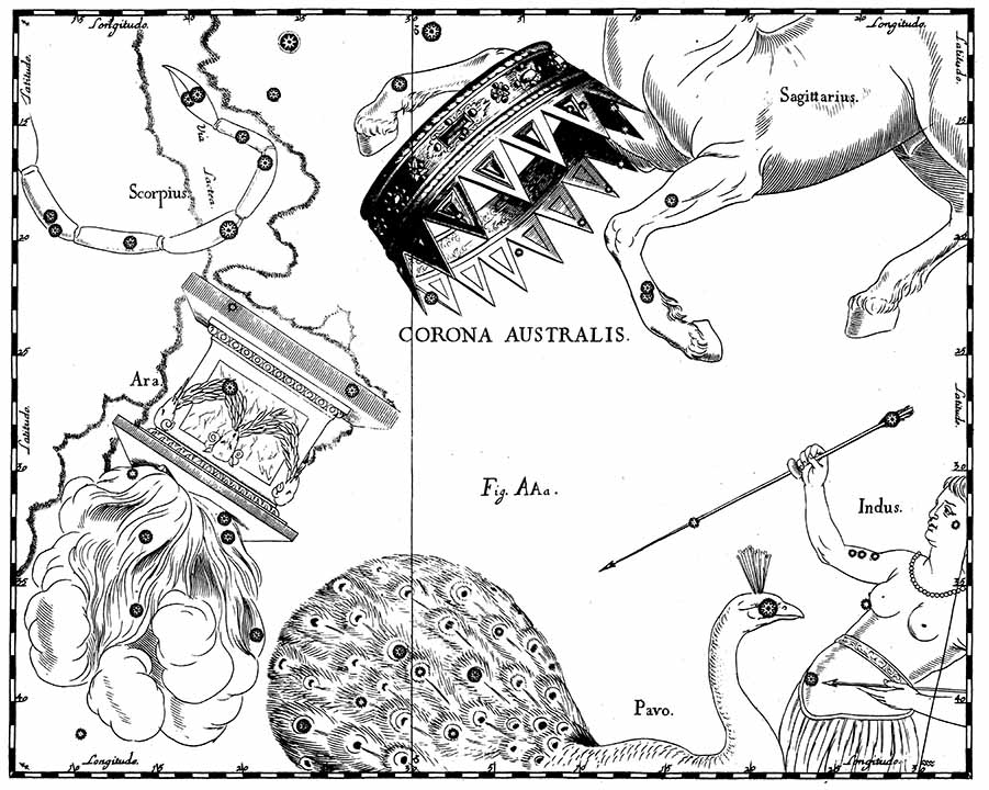 В китайской астрономии созвездие Южной короны называлось Речная черепаха. В египетской астрономии это созвездие именовалось Сетка. Древнегреческими астрономами было названо, судя по всему, из-за его сходства с созвездием Северной Короны. Соответственно, оно нашло свое место и в мифологии. На древних картах созвездие изображали в виде венца, упавшего с головы Стрельца. Видать быстро скакал кентавр, что даже потерял свою корону! Существует еще версия, что эту корону бог виноделия Дионис подарил беотийской поэтессе Коринне за победу в поэтическом соревновании. Она победила 5 раз одного из самых значительных лирических поэтов Древней Греции Пиндара, хотя в то же время была его наставницей. Что интересно, и Коринна, и Пиндар это реальные исторические личности, жившие в 5-6 в.в. до н.э.