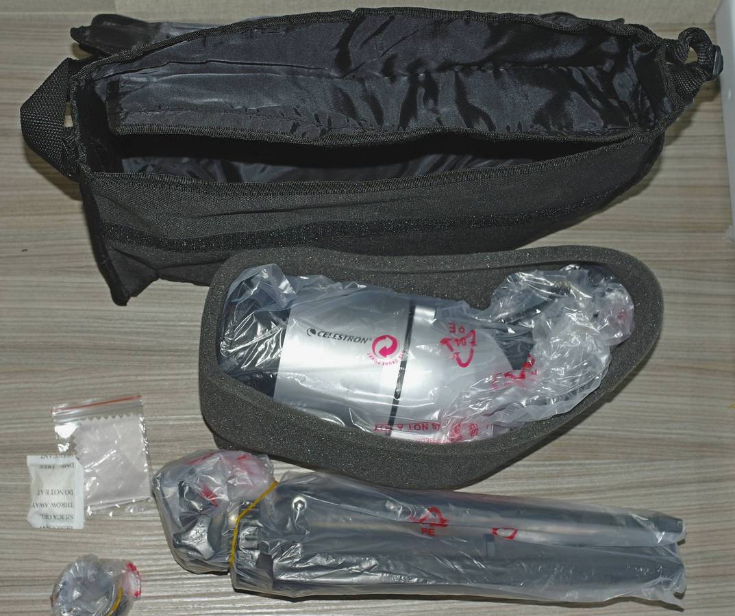 В сумке находится сама труба, небольшой настольный штатив, переходник для окуляров 1,25”, салфетка из микрофибры для протирки оптики, пакетик с силикагелем, инструкция. Сумка в коробке дополнительно уплотнена с торцов поролоновыми прокладками для лучшей сохранности при транспортировке.