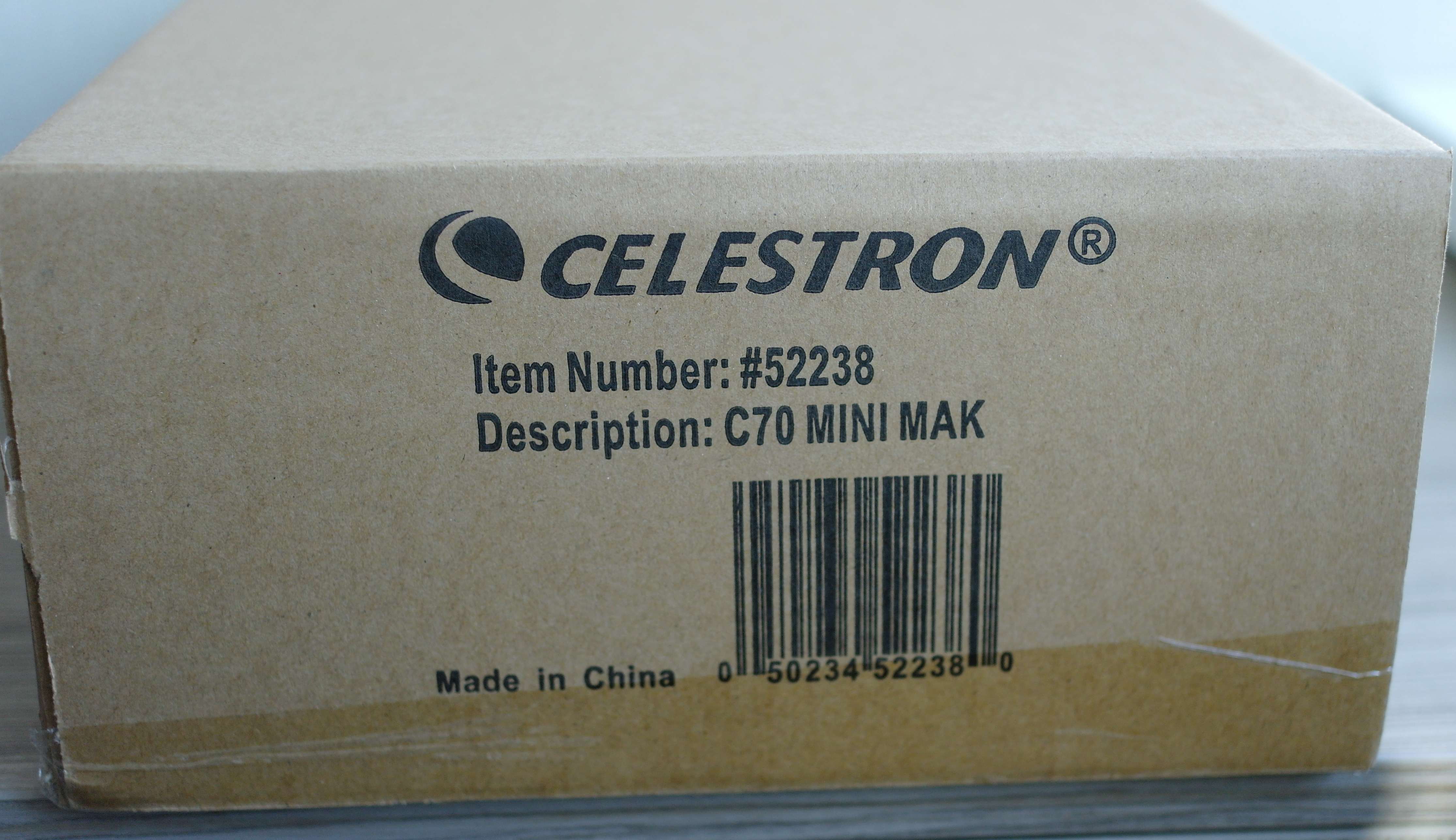 Данная модель так же надежно упакована в коробку из светло-коричневого плотного гофрокартона. На коробке нанесены надписи Celestron, серийный номер #52238, название модели Celestron C70 MiniMak и «made in China».