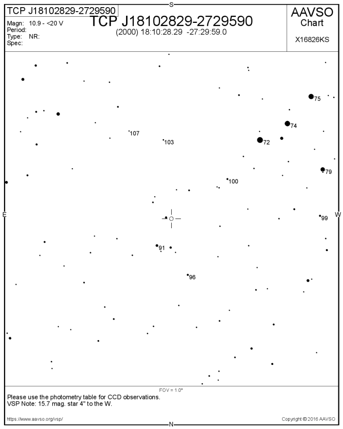20 октября 2016 года известным японским любителем астрономии Koichi Itagaki в созвездии Стрельца была открыта Новая звезда.На момент открытия она имела блеск 10,7m. По последним данным (23 октября) блеск Новой достиг 8m! К сожалению условия для её наблюдения на широте Харькова далеки от благоприятных. Около 19 часов по киевскому времени на еще сравнительно светлом небе высота над горизонтом всего 7 градусов. Да и с небом проблемы. В южных районах условия видимости несколько лучше. Координаты Новой: RA=18h 10m 28.29s, DEC=-27d 29' 59.0".