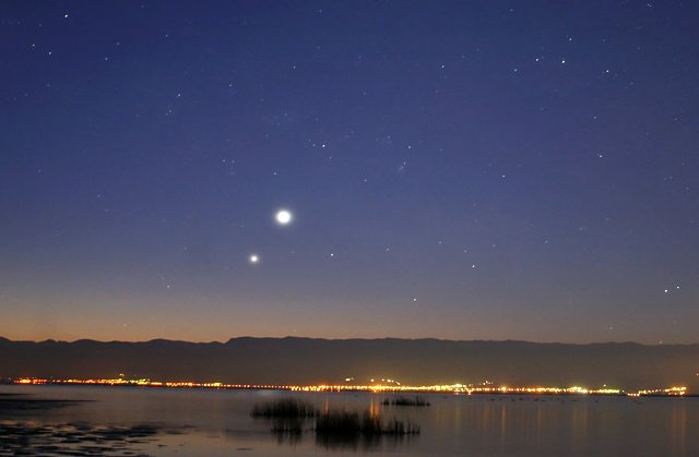 13-го ноября произошло соединение Венеры с Юпитером. Планеты находились на небе на расстоянии 0,3° друг от друга. Я пытался в этот день разглядеть на небе планеты, но плотная низкая дымка помешала. Потом не было ясного неба и вот сегодня удалось увидеть обе планеты. Юпитер выше и правее Венеры. Правда и расстояние между нами увеличилось примерно до трех градусов, но все равно очень красиво!