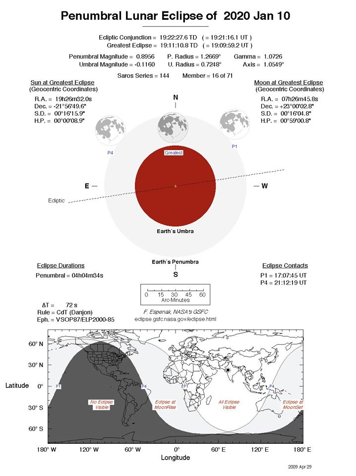 Поздно вечером 10 января 2020 года произойдет частное полутеневое лунное затмение с максимальной фазой 0,89, видимое на всей территории Украины (погоду, правда, не обещают