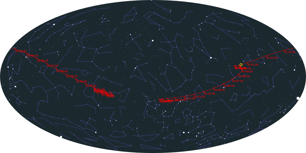 Комета хорошо различалась в поисковый окуляр ES30x70 в виде диффузного пятна с ростом яркости к центру. Ядро кометы особо не выделялось, нарастание яркости довольно плавное. Признаков хвоста различить не удалось.