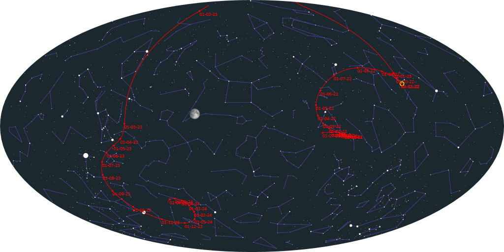 С вечера даже и не думал наблюдать комету C/2022 E3 ZTF. А начал с кометы C/2020 V2 ZTF, которая при блеске 9,2m движется сейчас поблизости от звезды Рукбах (δ Cas / δ Cassiopeiae) и располагается высоко над горизонтом. Комету нашел без особого труда в свой SW2001. Выглядела она невзрачным туманным пятнышком с увеличением яркости к центру. Окуляры 30, 17 и 9 мм. Затем навелся на окрестности кометы C/2022 U2 ATLAS, которая при блеске по разным данным от 9,8 до 11,0m движется сейчас поблизости от известного астеризма "Каскад Кембла" в созвездии Жирафа. Эту комету удалось различить с трудом боковым зрением в виде едва заметного туманного пятнышка. Я склоняюсь ближе к 11m. А затем подумал, почему бы не навестись и на комету C/2022 E3 ZTF. Сразу нашел ее в искатель. В телескоп она была видна хорошо. Просматривался даже хвост. Пытался различить ее невооруженным глазом, но неудачно, хотя звезда RR Малой Медведицы, расположенная рядом, различалась легко. Может она и "забила" комету... Была еще мысль поискать комету C/2022 A2 PANSTARRS, которая с блеском 9,4m движется в созвездии Дракона, но передумал. Северный горизонт затянут дымом, а высота кометы над горизонтом всего около 18 градусов. Если не просплю, попытаюсь найти ее под утро. Тогда же попробую различить и комету C/2022 E3 ZTF невооруженным глазом.