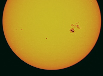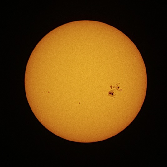 Вчера удалось снять Солнце со двора многоэтажки. Телескоп не выносил, использовал фототелеобъектив Таир-11 (135/2.8) и двухкратный телеконвертор, итого фокусное расстояние 270 мм, фотоаппарат Кэнон 550Д. Солнечный фильтр изготовлен самостоятельно - между двумя родными светофильтрами Таира (зеленым и оранжевым) размещена пленка от дискеты. через этот фильтр пятно прекрасно различалось и невооруженным глазом Снимал и видеоролик и фоторежим РАВ. Обработка в Регистак 5.