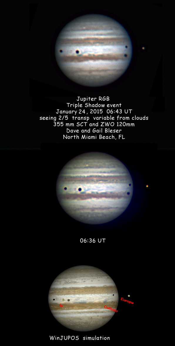 Наметил вчера вечером поиск нескольких астероидов, но помешала дымка. Астероиды все были не ярче 13,7m, и рассчитывать было не на что. Навелся на Юпитер и наблюдал прохождение тени Ио по его диску. Тень спутника выделялась отчетливо, особенно при увеличениях более 150х. А вот сам спутник на фоне диска различить не удалось. Малый контраст скрадывался усилившейся дымкой.