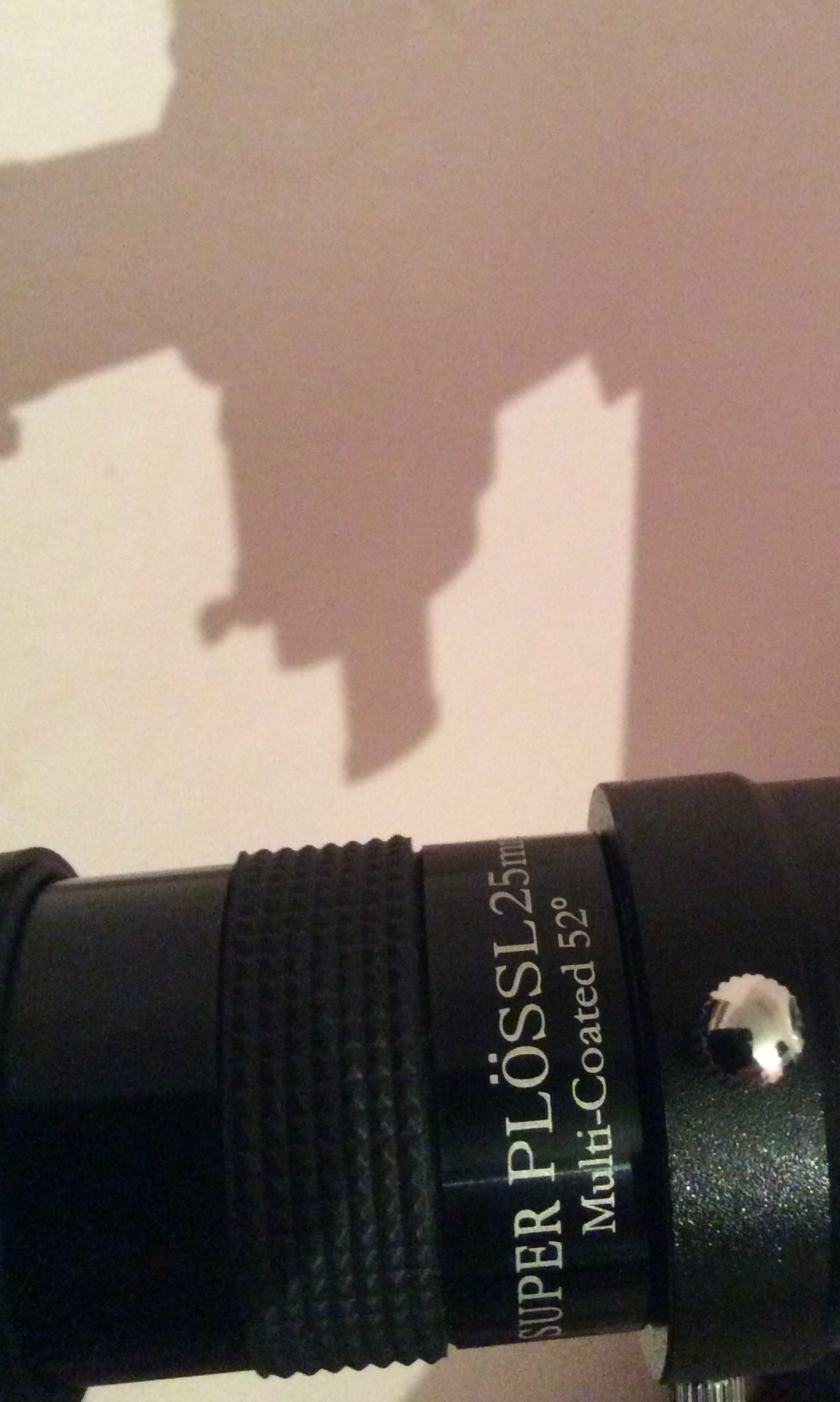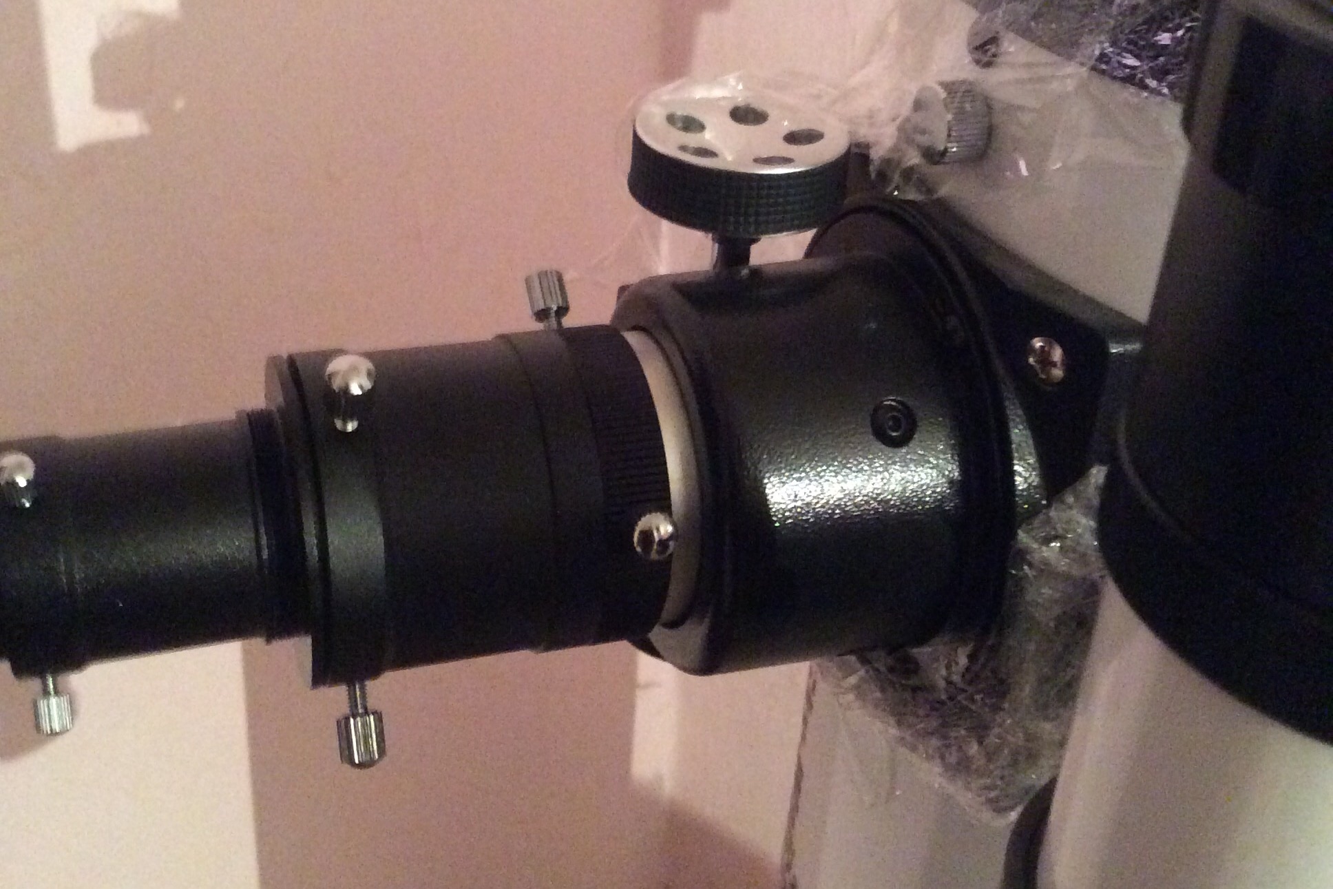 У Вас сейчас стоит ДВА переходника: - первый (верхний) в котором закреплен окуляр (он похож на гриб), его надо вставить прямо в фокусер - второй (нижний), он применяется для 2" окуляров, его надо УБРАТЬ.