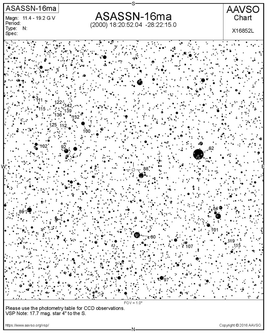 Координаты Новой: RA (J2000) = 18:20:52.12 DEC (J2000) = -28:22:13.52