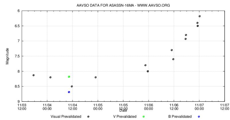 К сожалению у нас эта Новая уже практически не доступна для наблюдений. Её блеск снизился до 8,5m, а элонгация от Солнца уменьшается. Мне так и не удалось её увидеть.