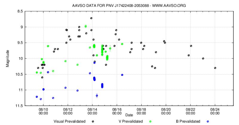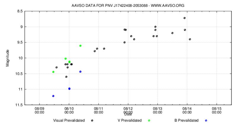Блеск Новой Змееносца после некоторой стабилизации опять начал падать и стал слабее 10m. Луна уже прошла район распоряжения Новой, и вскоре её можно будет наблюдать без помех, но в более крупные инструменты.