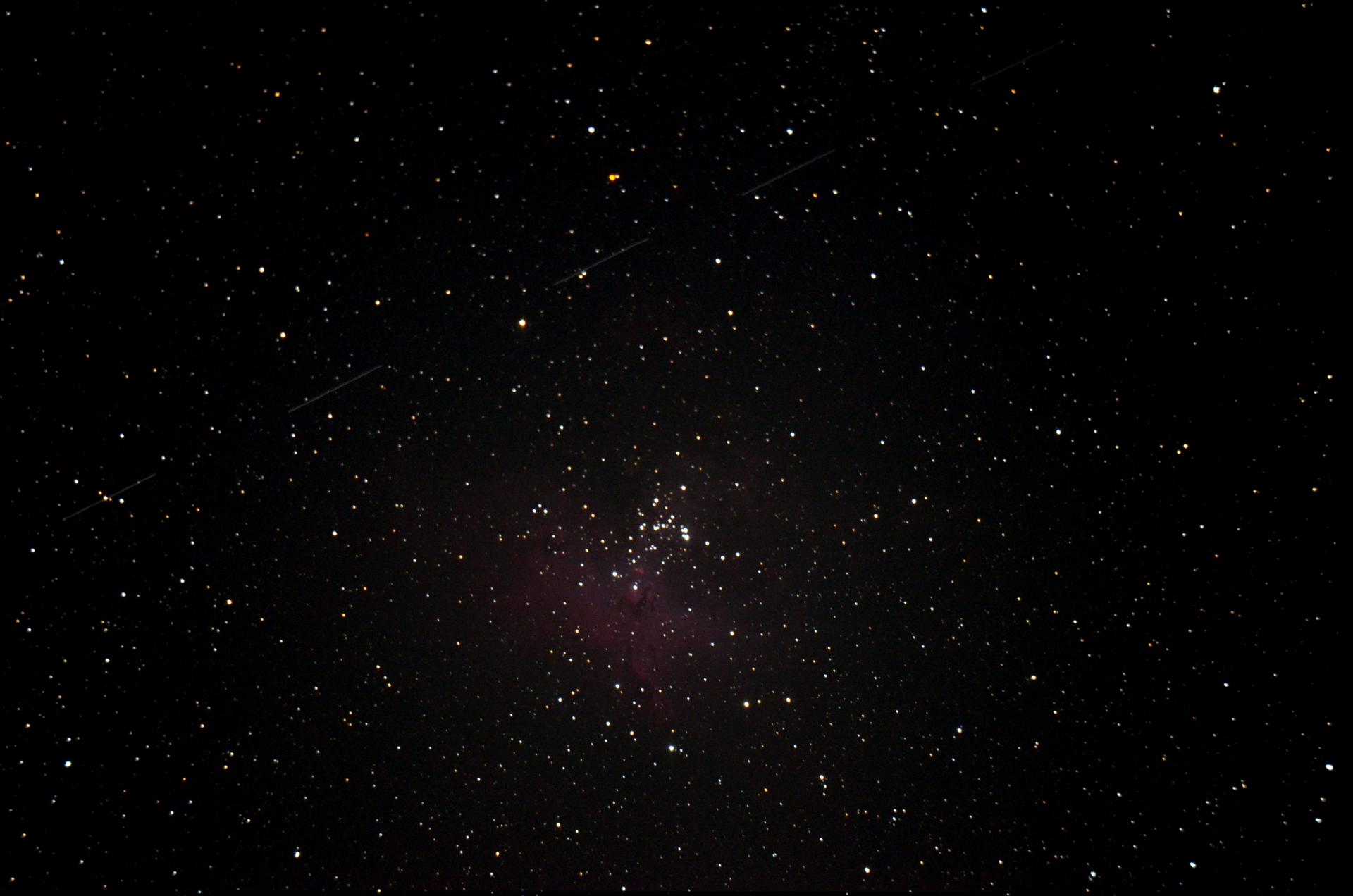 Привет друзья. Вопрос к знатокам: Вот фотка М16 (24.07.2015). Сложено 10 кадров по 25 секунд. Подскажите, что за объект оставил эти треки? (На пяти кадрах трек.) Думал, что спутник, так он по идее должен был за 25 секунд весь кадр пролететь, а тут нефига... Может быть астероид?